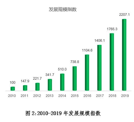2019年,發(fā)展規(guī)模指數(shù)為2207.1,同比增長(zhǎng)25.0%。